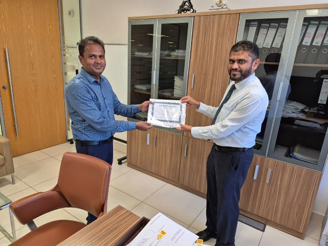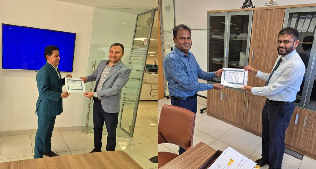 Bahwan Healthcare Centre’s Pharma division and principal company M/s Pharma Solution held business review meeting to discuss strategy for 2025 and product launches in Ministry and Private sector. Mr. Khurshid Zaidi, Managing Director and Mr. Sameh Kadry, Country Manager for other GCC of M/s Pharma Solutions presented certificate of appreciation to Mr. Mohammed Iqbal Hadi and Mr. Mohammed Ali Attia Tammam of BHC-Pharma Division for their outstanding sales performance of TauroLock™ Catheter lock solution for the year 2024.